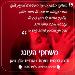 תשכחו מהרצאות ותיאוריה, בסדנה הזו באים לשחק ולהתענג במרחב נועז שכולו מגע וחושניות (ביניכם בלבד). 3 שעות בבועה זוגית של משחקיות ואינטימיות עמוקה שיגרמו לכם להשתוקק ולהתאהב מחדש. אל תתכננו תוכניות לבוקר שאחרי, כי האש שתדליקו כאן לא הולכת לכבות כל כך מהר.