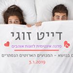 דייט זוגי, זמן איכות מהנה ומלמד, לזוגות. דייט זוגי היא סדנה חודשית, כשכל מפגש עומד בפני עצמו. בואו למרחב של למידה ומשחק, של העמקה של הביחד שלכם. בואו ללמוד כלים של קרבה ותקשורת, מגע ומיניות.
